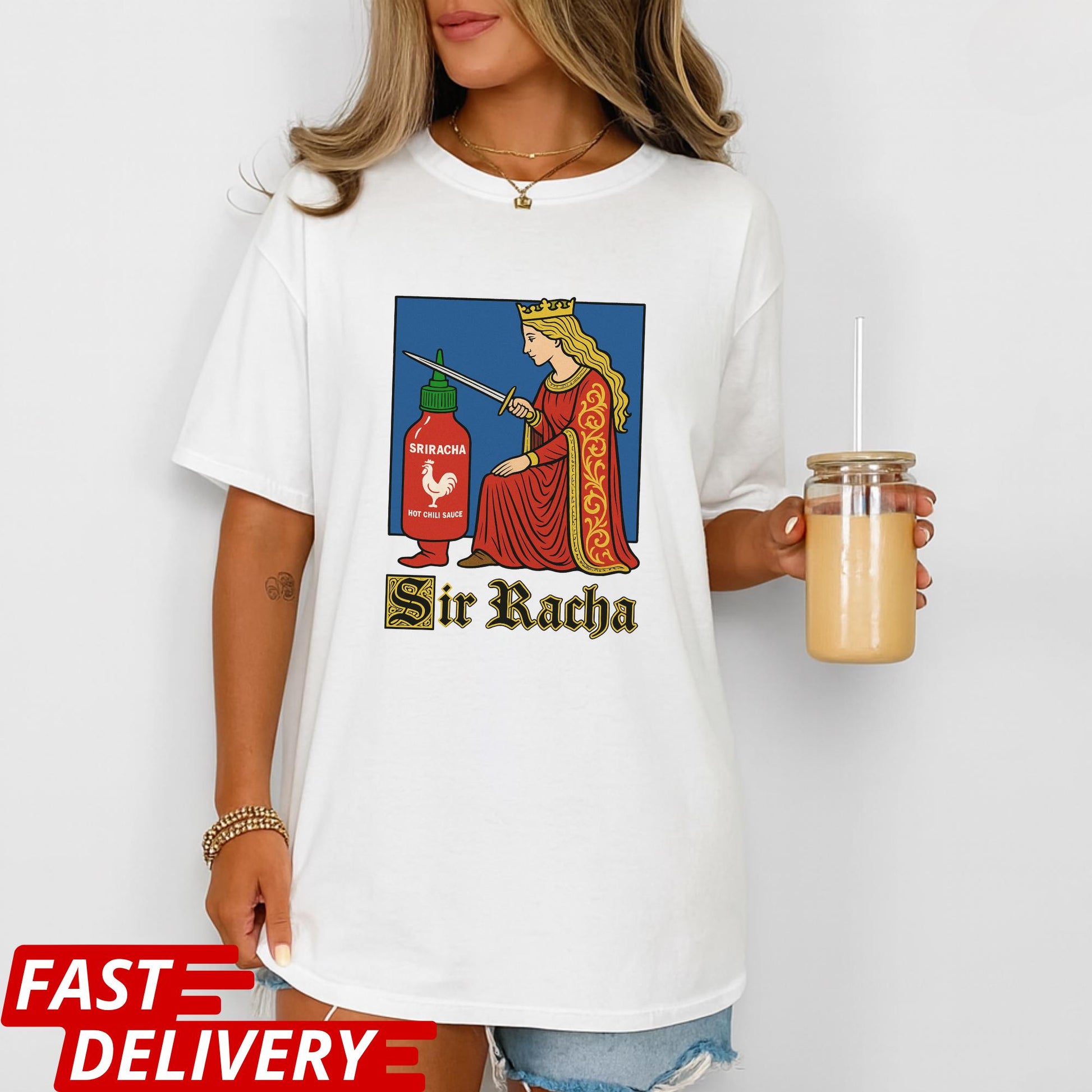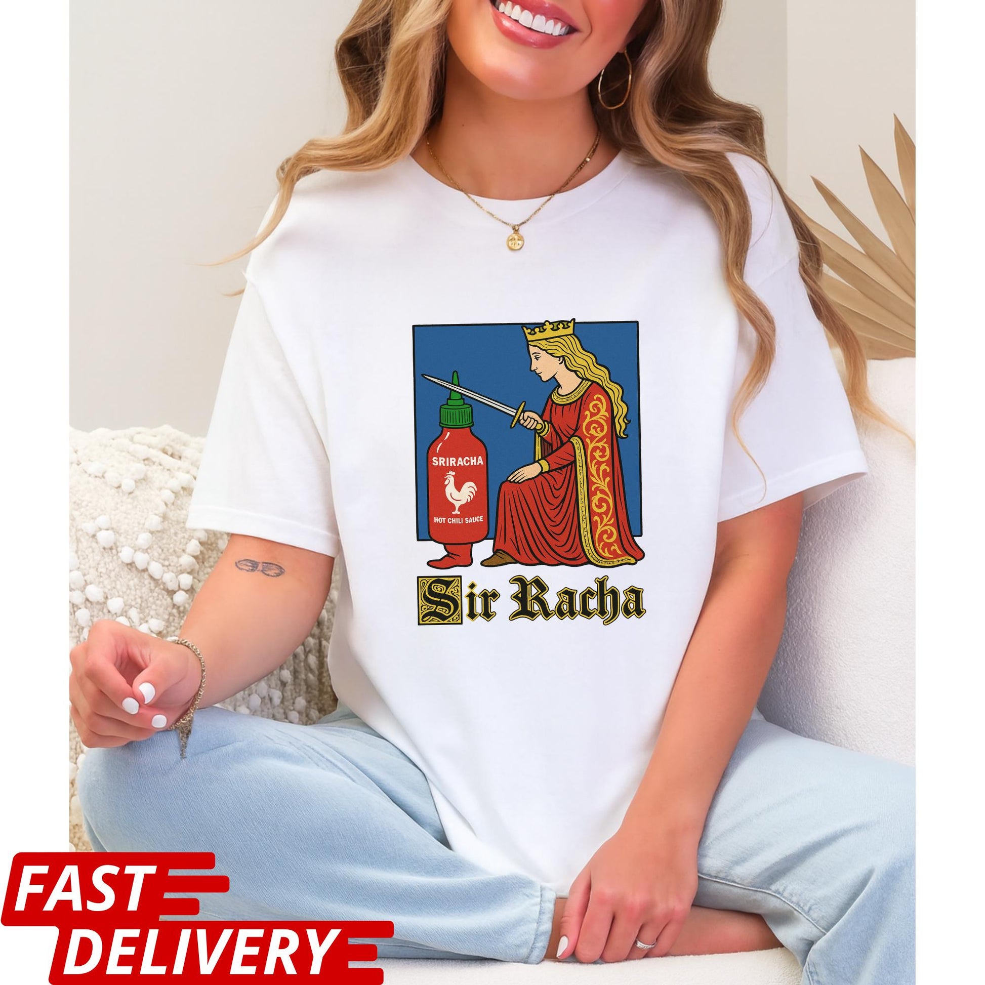 Spice up your wardrobe with this hilarious "Sir Racha" graphic tee! This design features a unique medieval-style artwork where a noble queen knights a bottle of Sriracha hot sauce — a bold and witty twist perfect for food lovers and humor enthusiasts alike. The vintage-inspired illustration combined with modern pop culture makes this shirt an ideal gift for hot sauce fans, pun lovers, or anyone who appreciates clever, artistic designs.