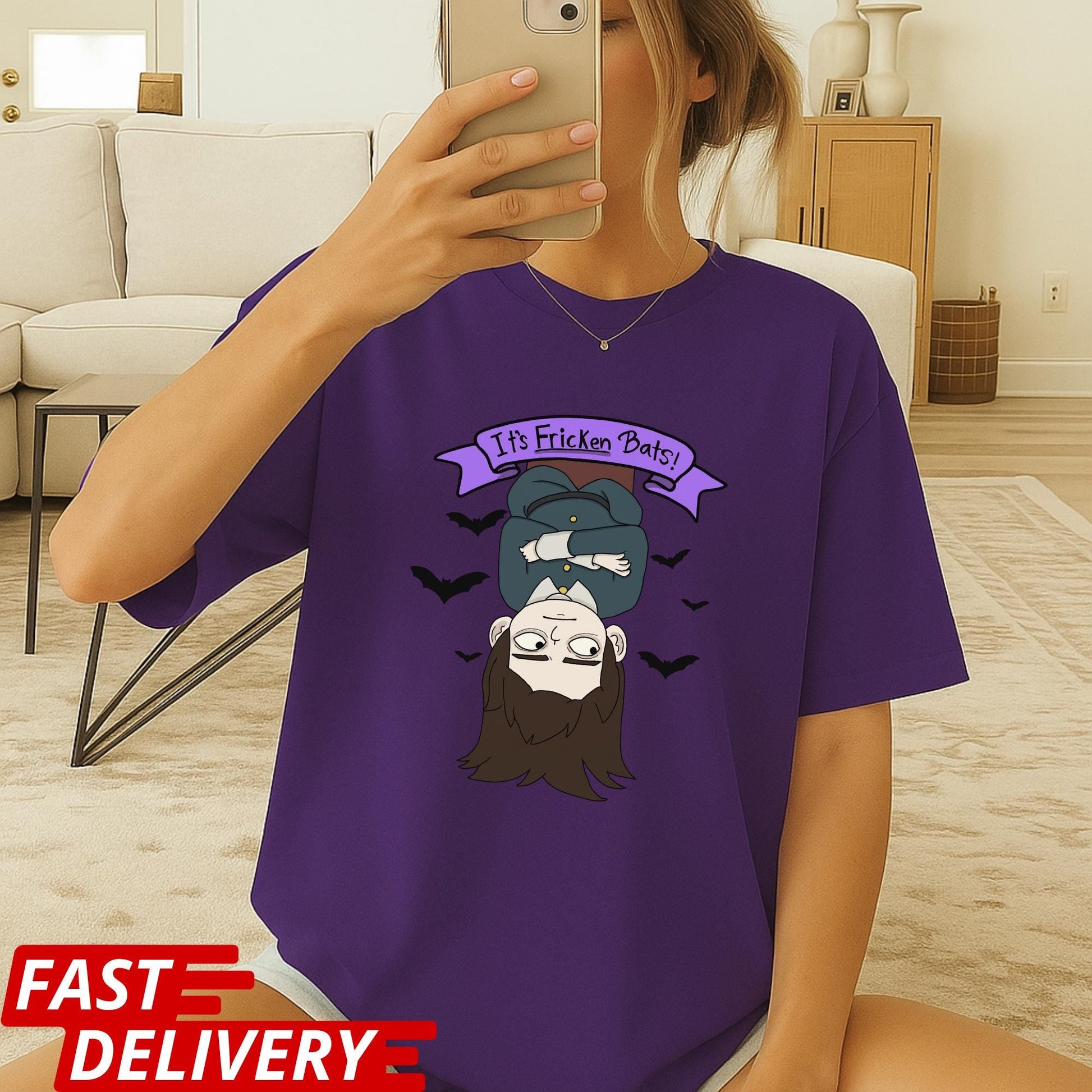 Featuring an upside-down cartoon character surrounded by flying bats and a playful phrase, this design is made for those who love Halloween vibes all year round.