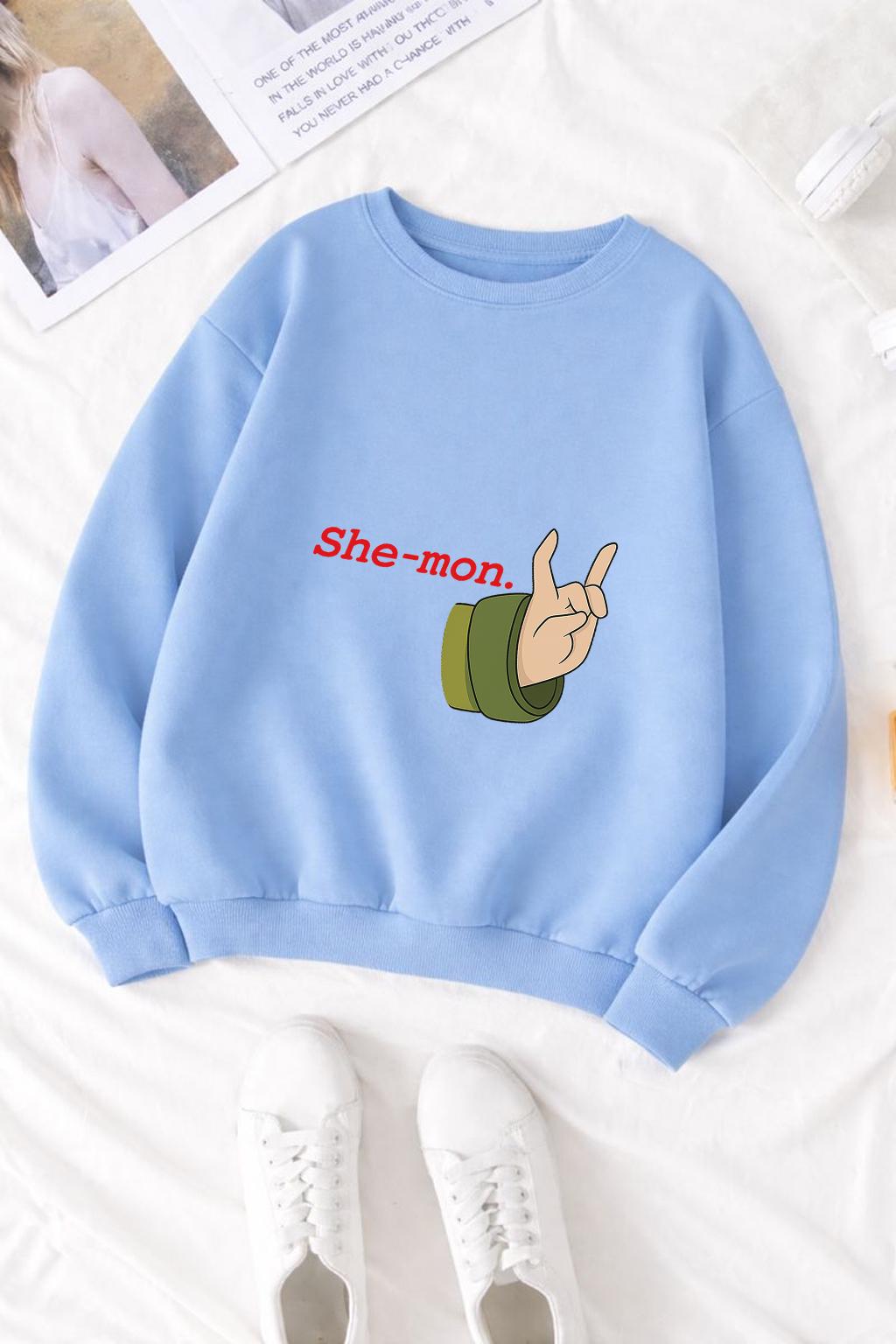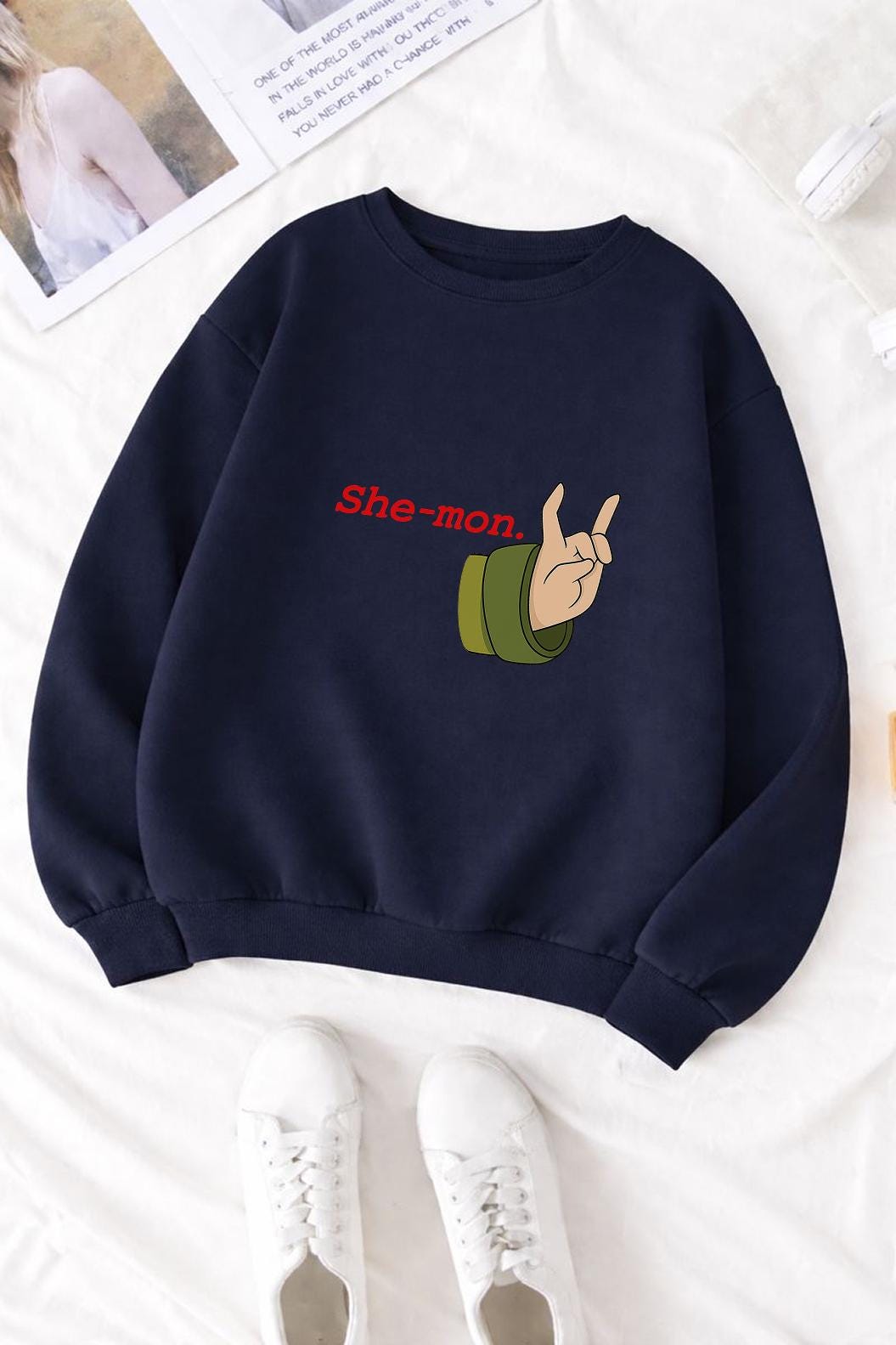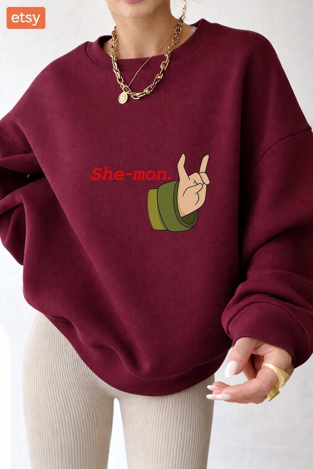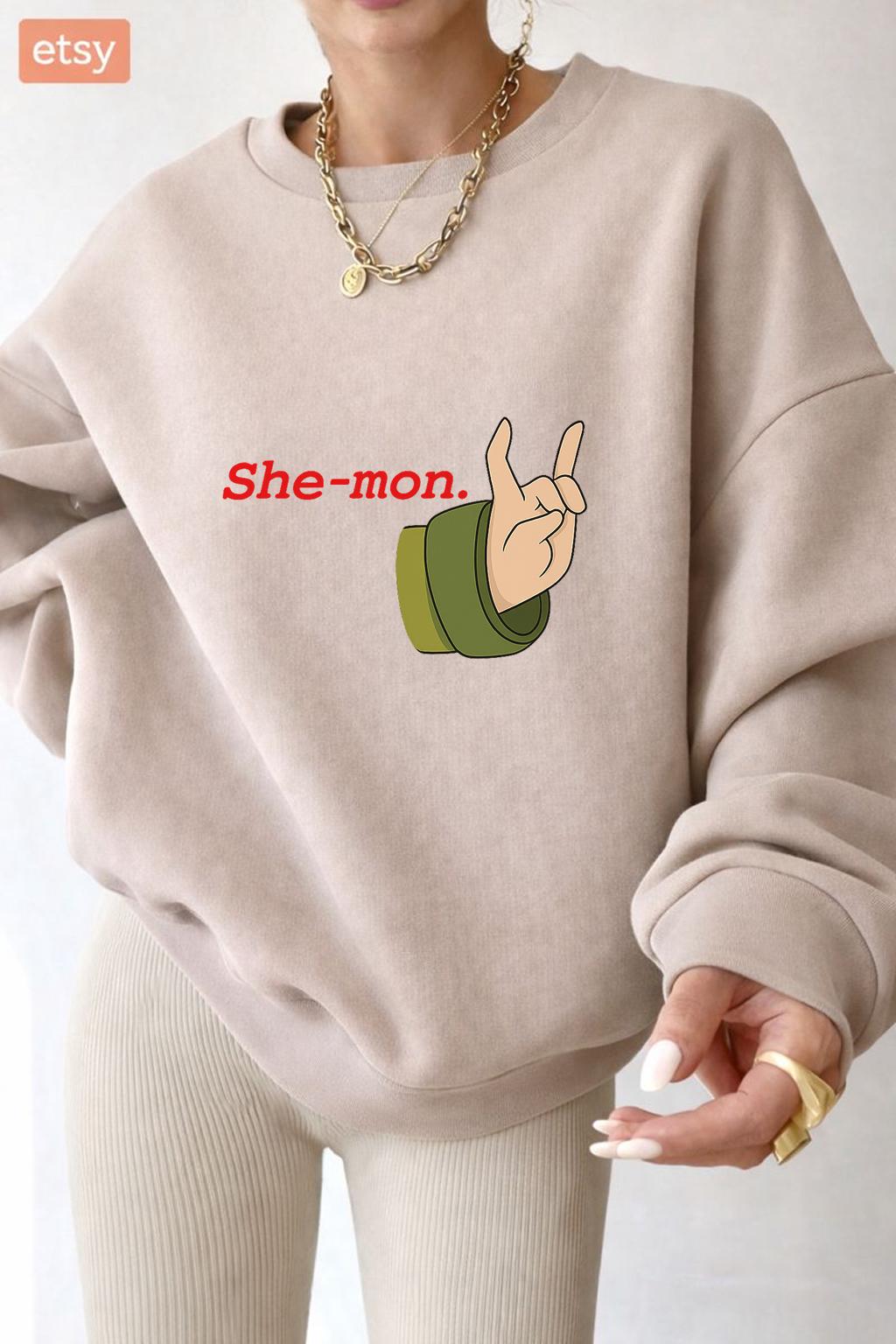 Featuring the iconic “She-mon.” quote paired with a playful cartoon hand gesture, this design blends spooky vibes with sarcastic comedy. It’s minimal, eye-catching, and instantly recognizable for fans who love clever horror humor.