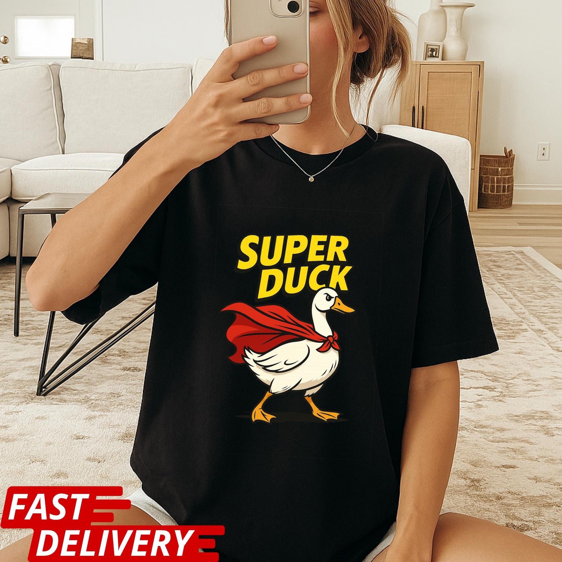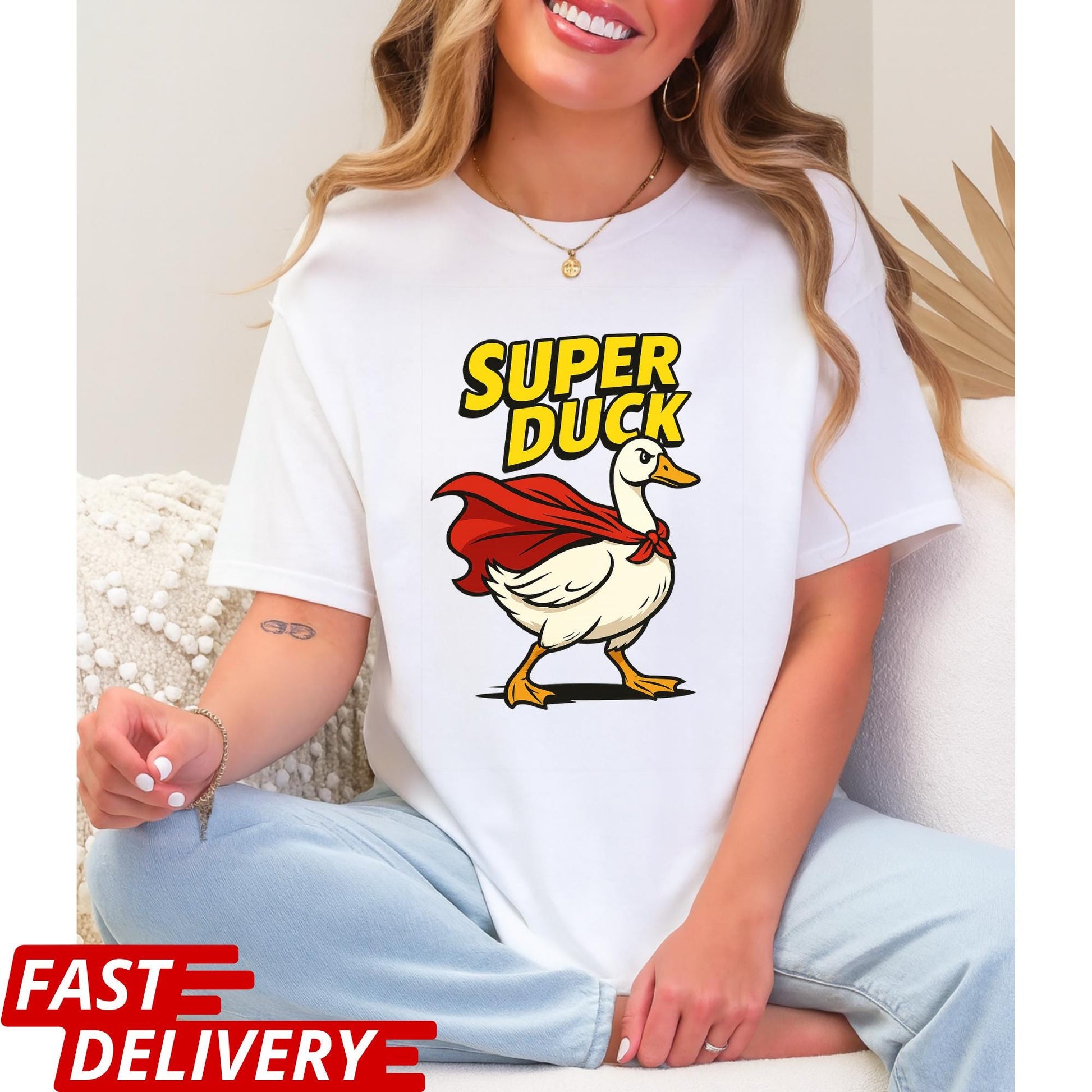 Unleash your inner hero with this hilarious “Super Duck” t-shirt! Featuring a bold cartoon-style duck wearing a red superhero cape, this design is a perfect blend of cute and comical. Whether you're a duck lover, a fan of quirky animal art, or just enjoy fun graphic tees, this shirt is sure to bring smiles wherever you go.
